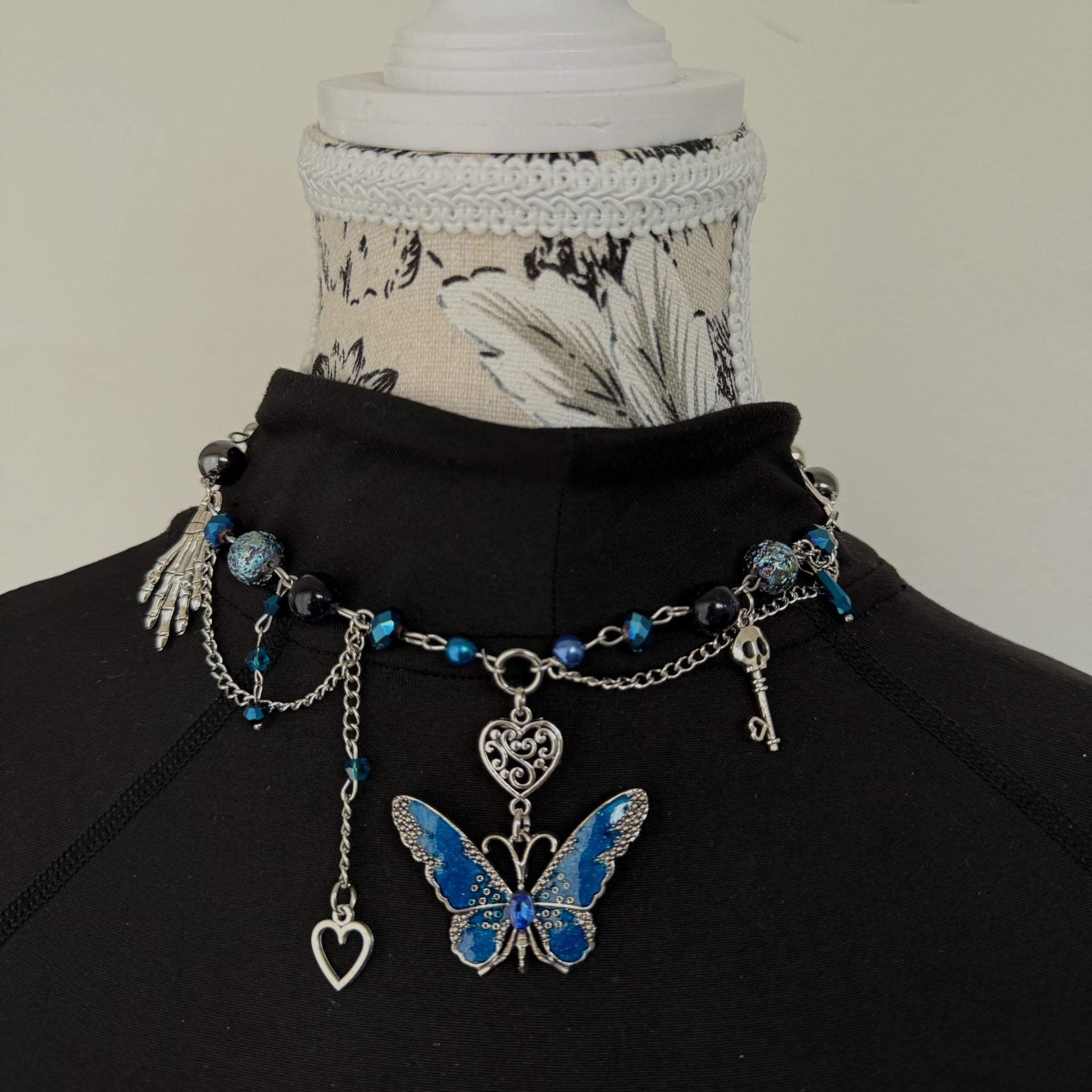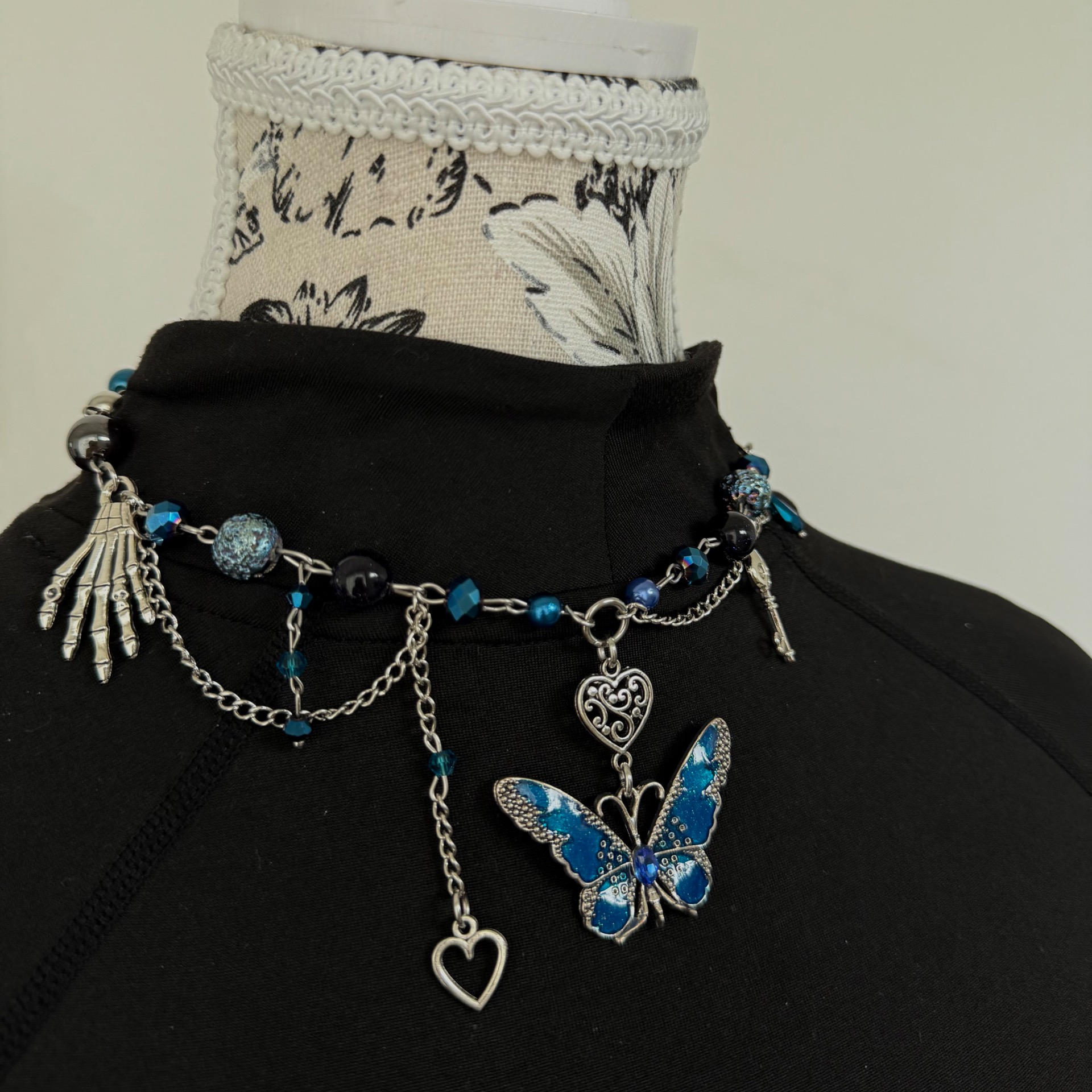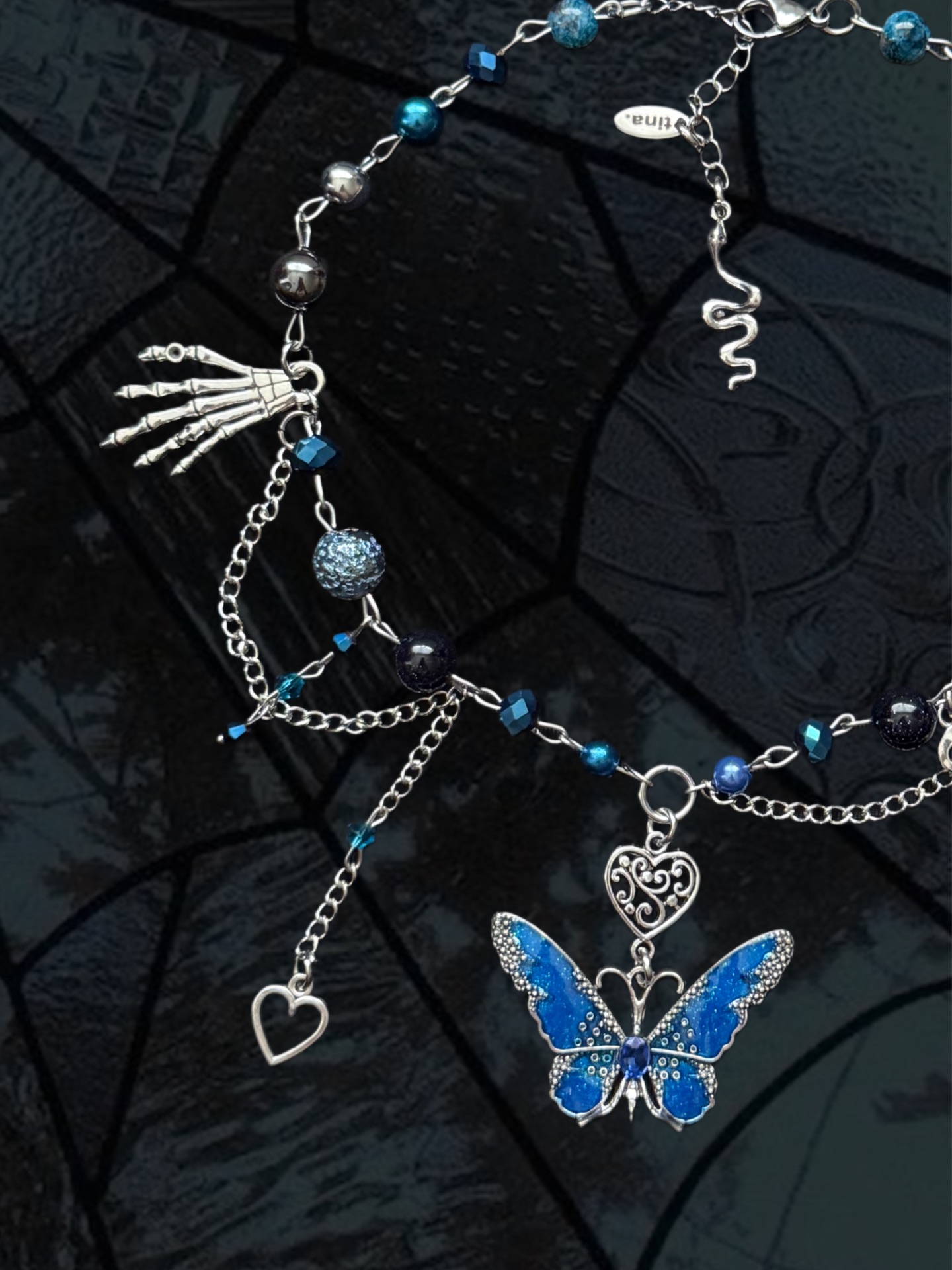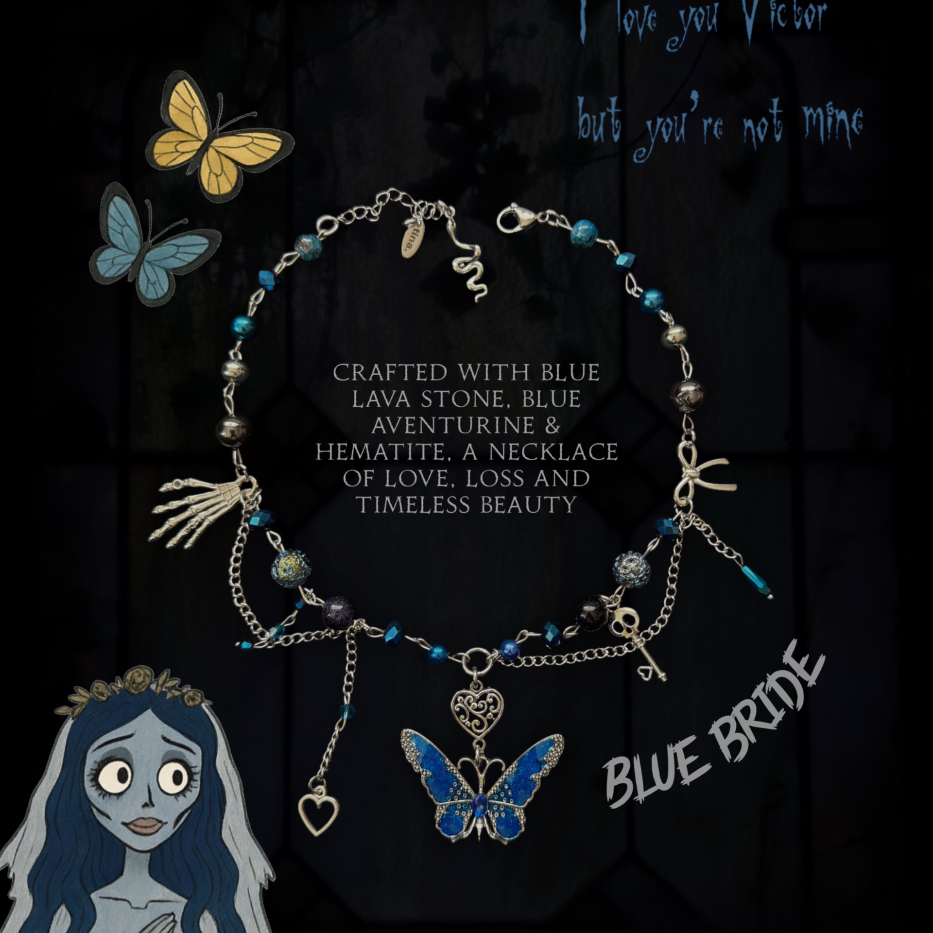 Tento náhrdelník je súčasťou Halloweenskej kolekcie. Obsahuje modrý lávový kameň, modrý avanturín a hematit – kombináciu, ktorá prináša rovnováhu medzi citom a rozumom, dodáva odvahu a pomáha uvoľniť stres. Lávový kameň je symbolom vnútornej sily a uzemnenia, avanturín podporuje pokoj, nádej a sebavedomie, zatiaľ čo hematit prináša ochranu a stabilitu. Využila som aj filmovú symboliku ako srdce, hadík, ruka, kľúč či motýľ, ktoré sú z bižutérie. Komponenty sú ale z chirurgickej ocele.