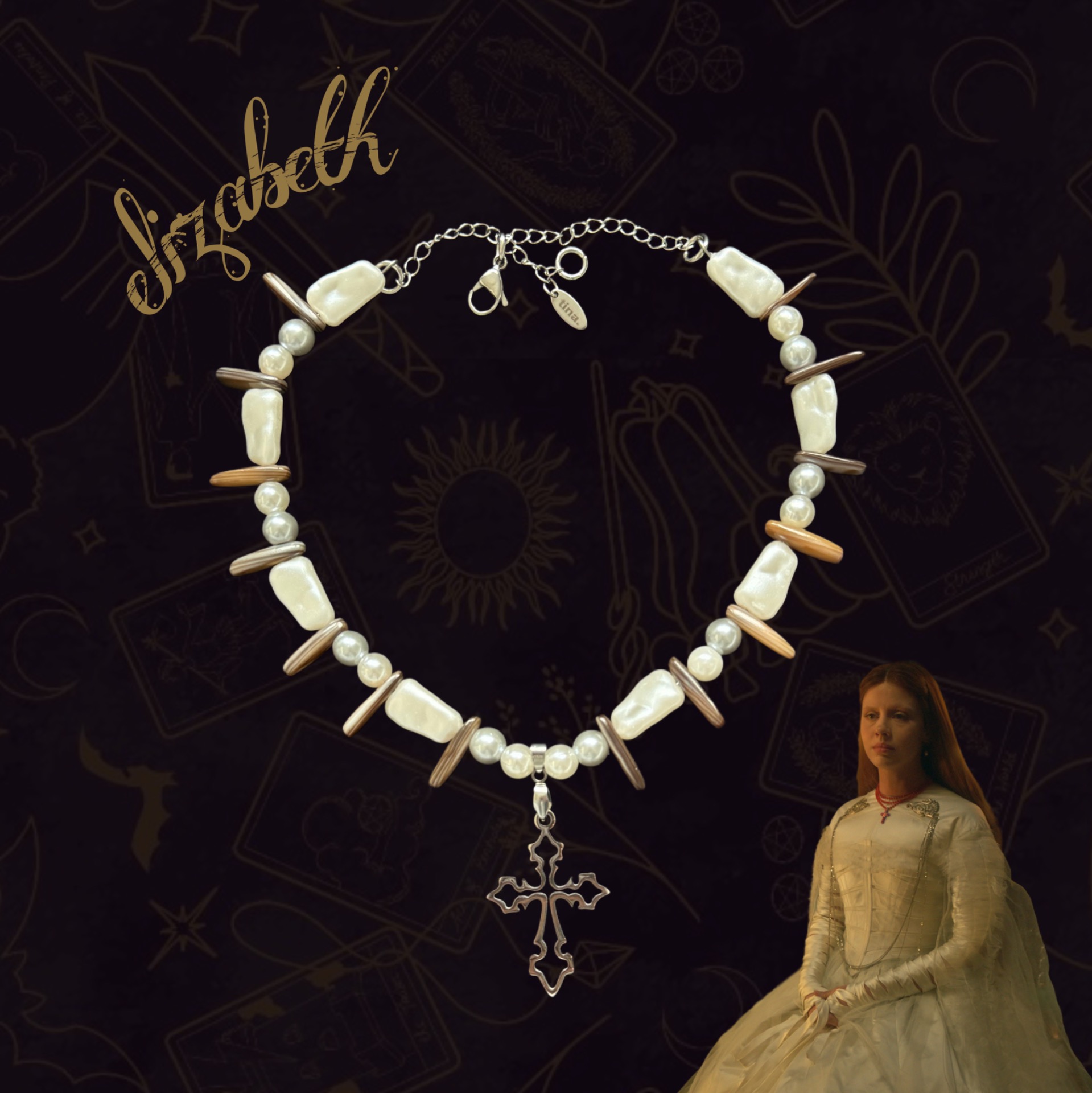 This necklace is inspired by the new Frankenstein film, specifically by the character Elizabeth. It blends imitation pearls with Achad Botswana agate and features a stainless-steel cross. All components are made from high-quality stainless steel.