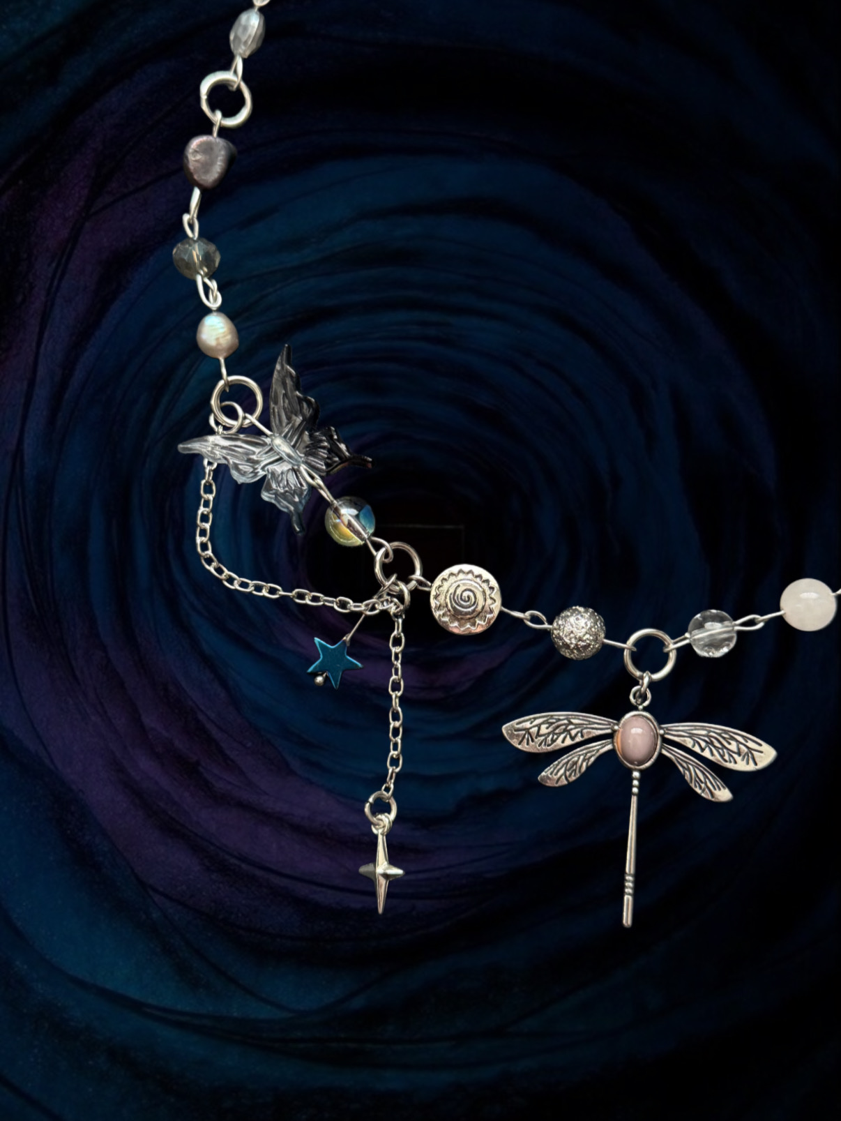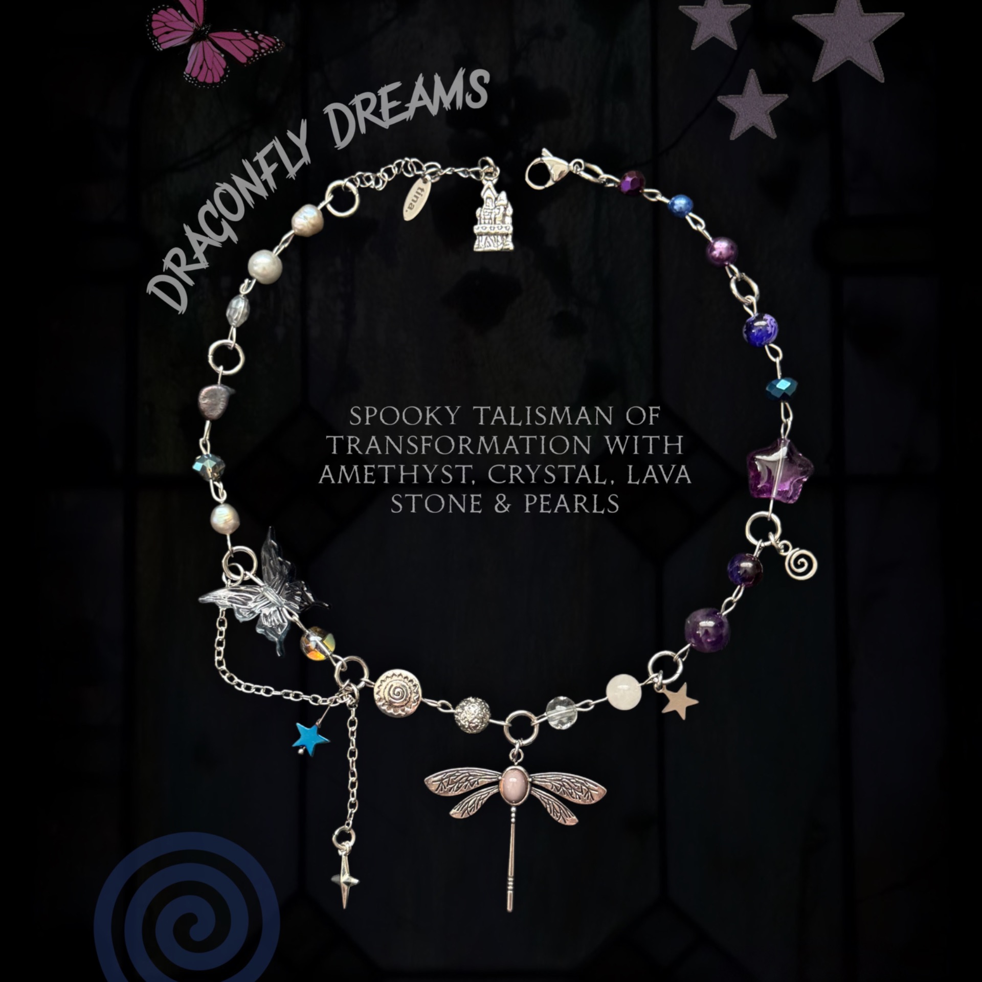 Tento náhrdelník je súčasťou halloweenskej kolekcie. Obsahuje ametyst, krištáľ, lávový kameň a perly – spojenie, ktoré prináša transformáciu, čistotu a vnútornú silu. Ametyst podporuje intuíciu, duchovný rast a ochranu, krištáľ dodáva jasnosť a energiu, lávový kameň uzemňuje a posilňuje stabilitu, zatiaľ čo perly prinášajú jemnosť, ženskosť a harmóniu. Symbol vážky predstavuje premenu, sny a schopnosť premeniť svetlo aj tieň na krásu.  Prívesky sú bižutérie ale komponenty sú z chirurgickej ocele.