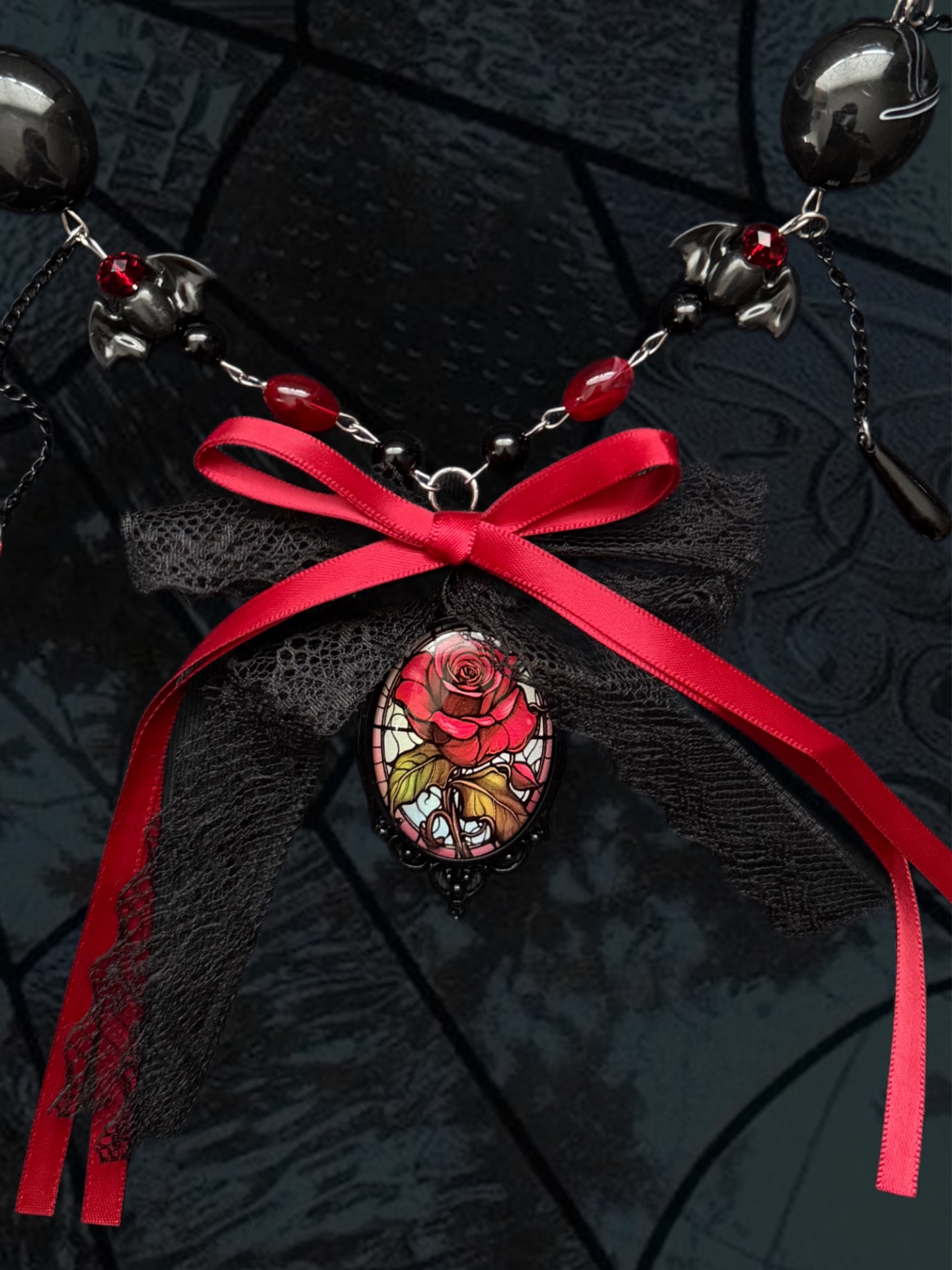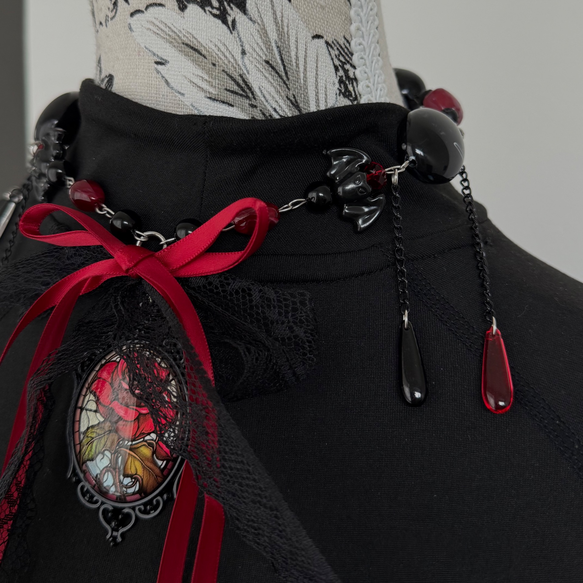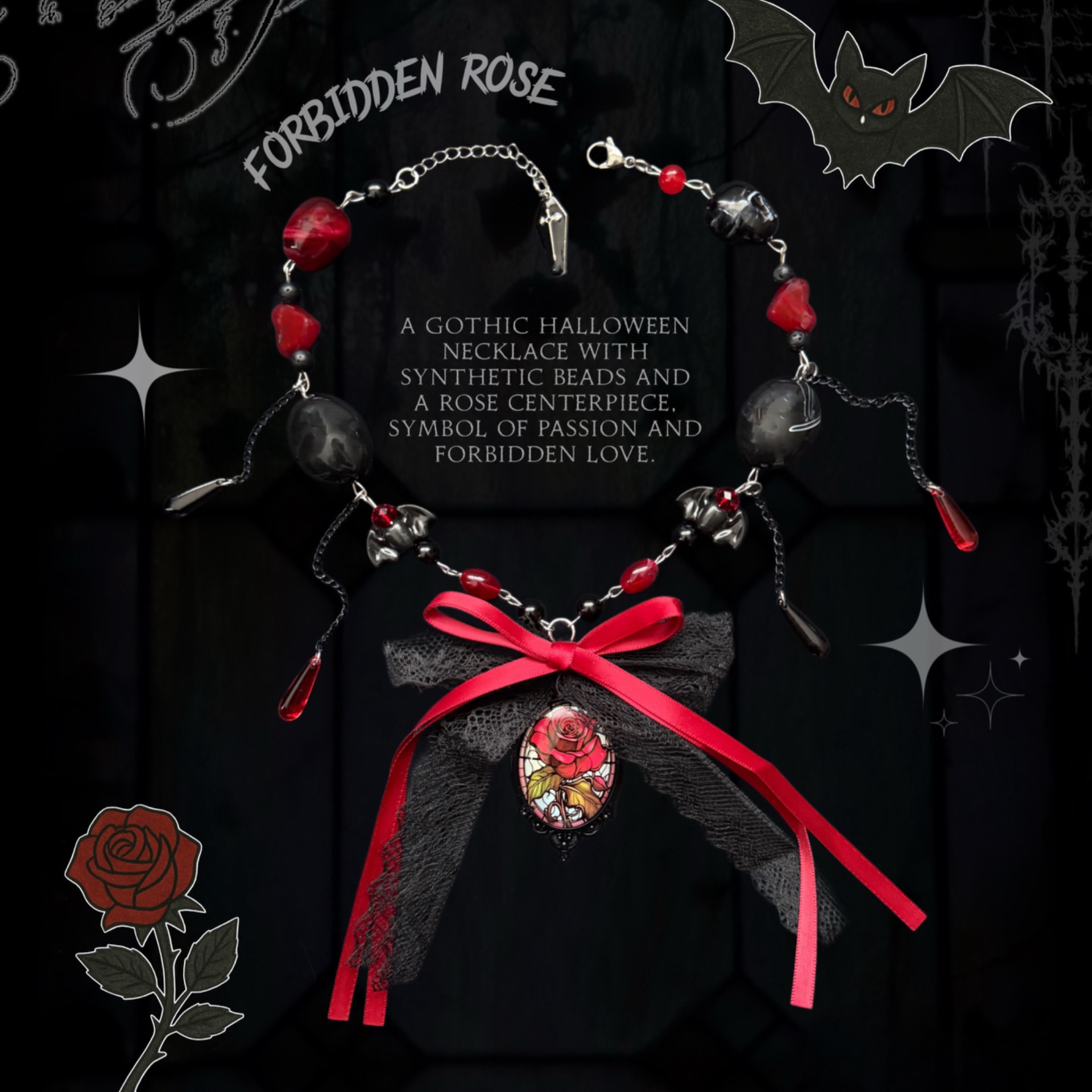 This necklace is part of the Halloween collection. It is crafted with synthetic beads and features a rose centerpiece – a symbol of passion, mystery, and forbidden love. The combination of dark and red tones radiates powerful energy, evoking the intensity of emotions and the beauty hidden within shadows.