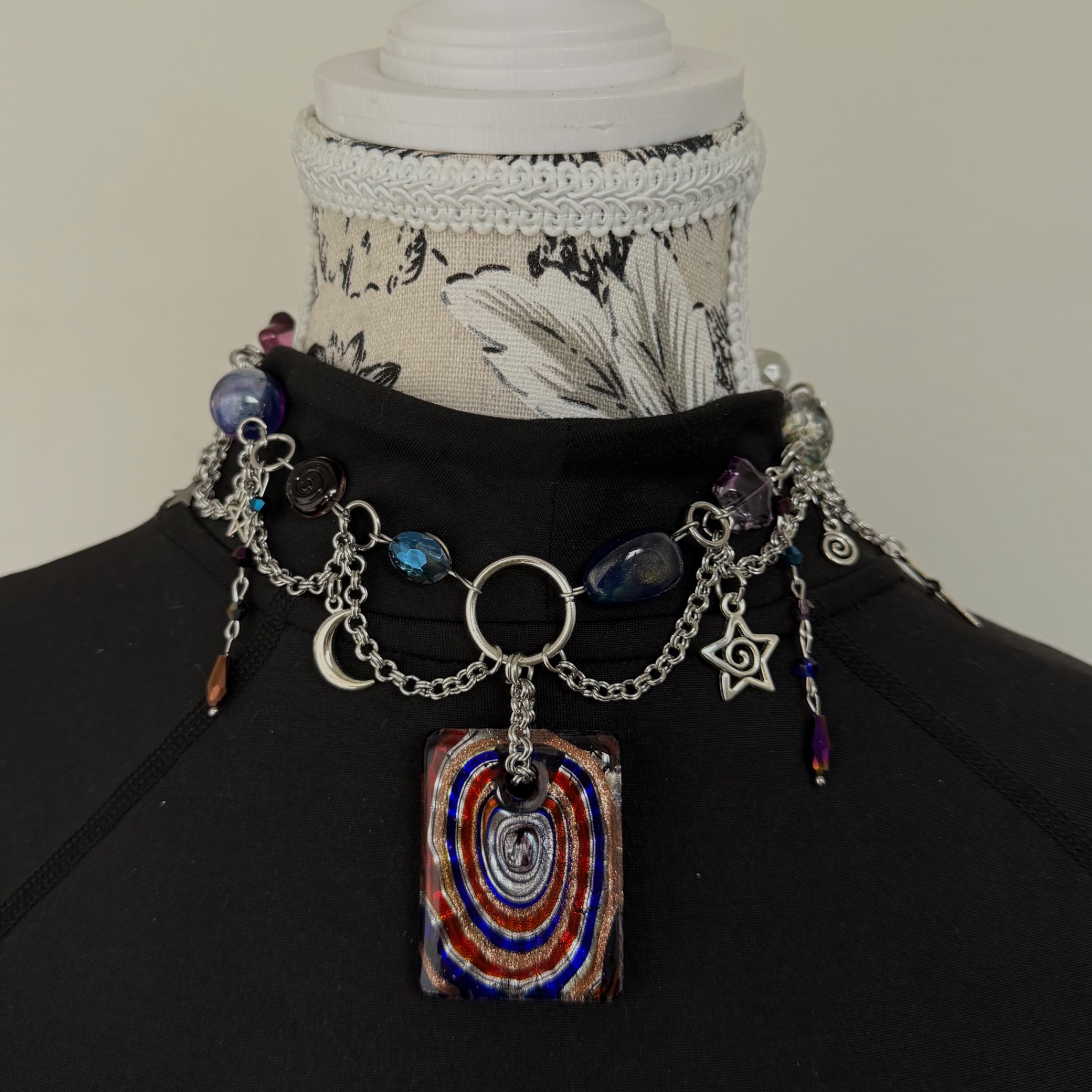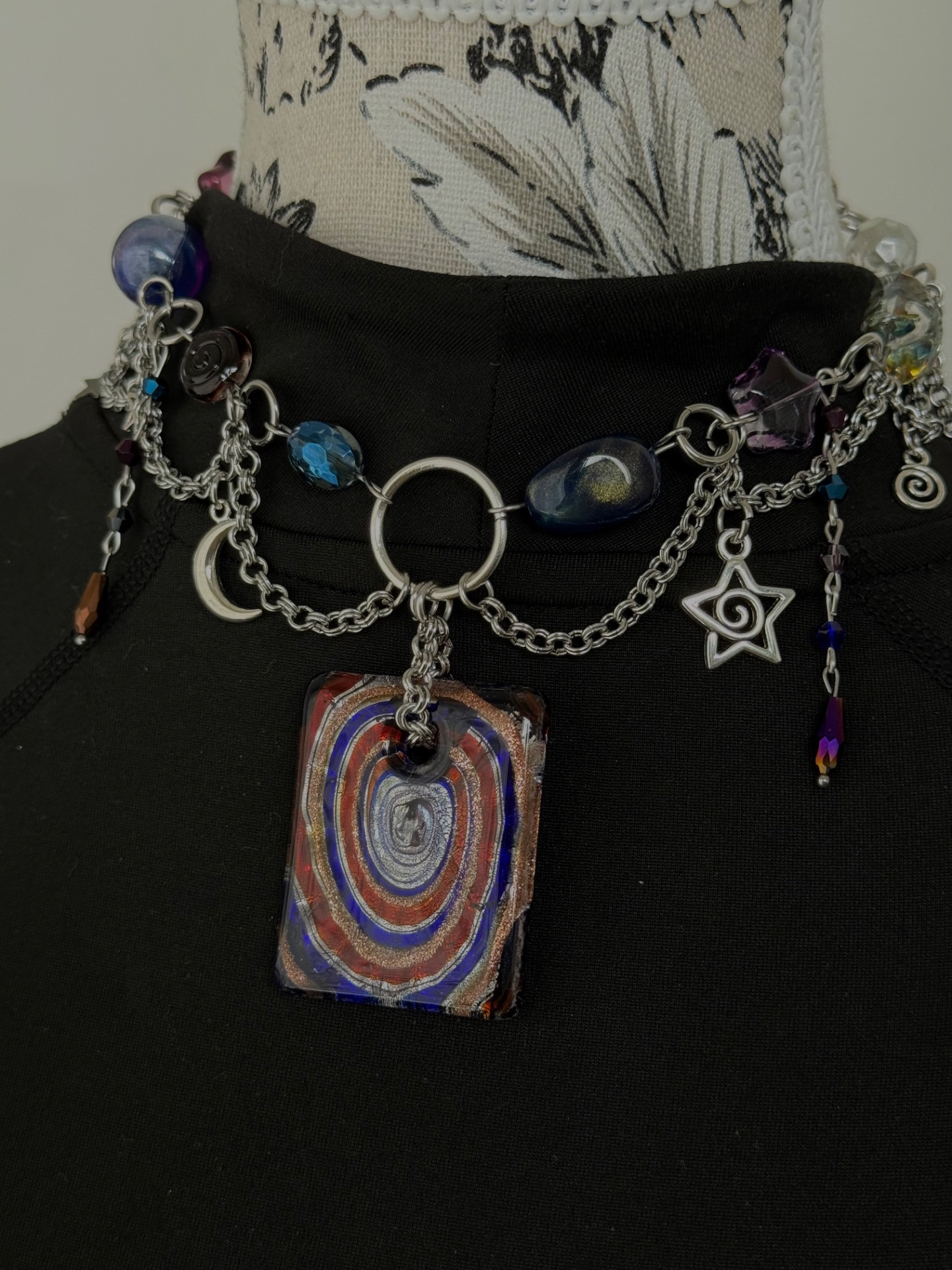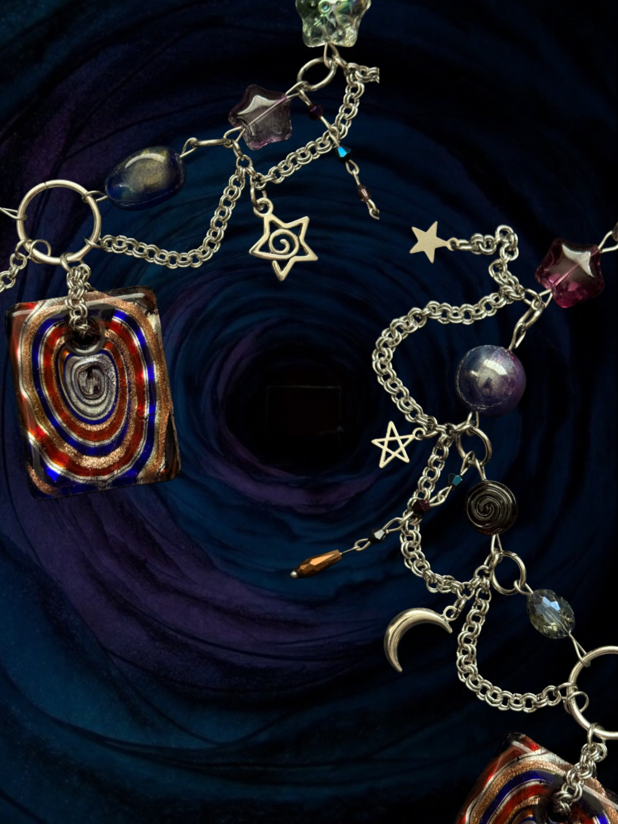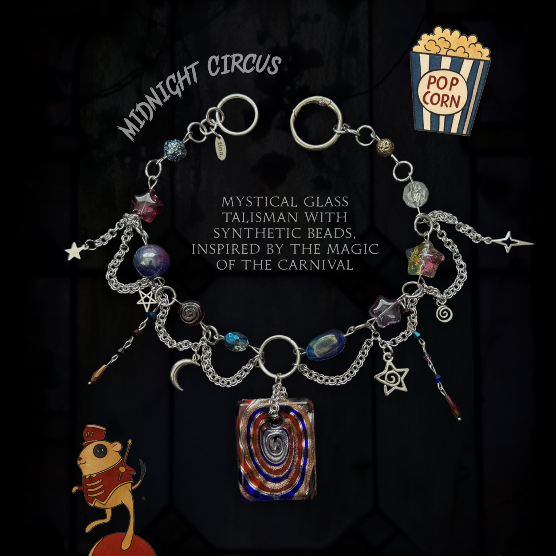Tento náhrdelník je súčasťou Halloweenskej kolekcie. Je vytvorený zo syntetických korálok a zdobený výrazným skleneným príveskom, ktorý odráža svetlo a dodáva mu mystický nádych. Sklo symbolizuje krehkosť, čistotu a hravosť, zatiaľ čo korálky prinášajú do celku energiu fantázie a snov. Náhrdelník je inšpirovaný mágiou cirkusu a nesie v sebe atmosféru noci plnej tajomstva a zábleskov svetiel. Prívesky sú z bižutérie ale retiazky sú z chirurgickej ocele.