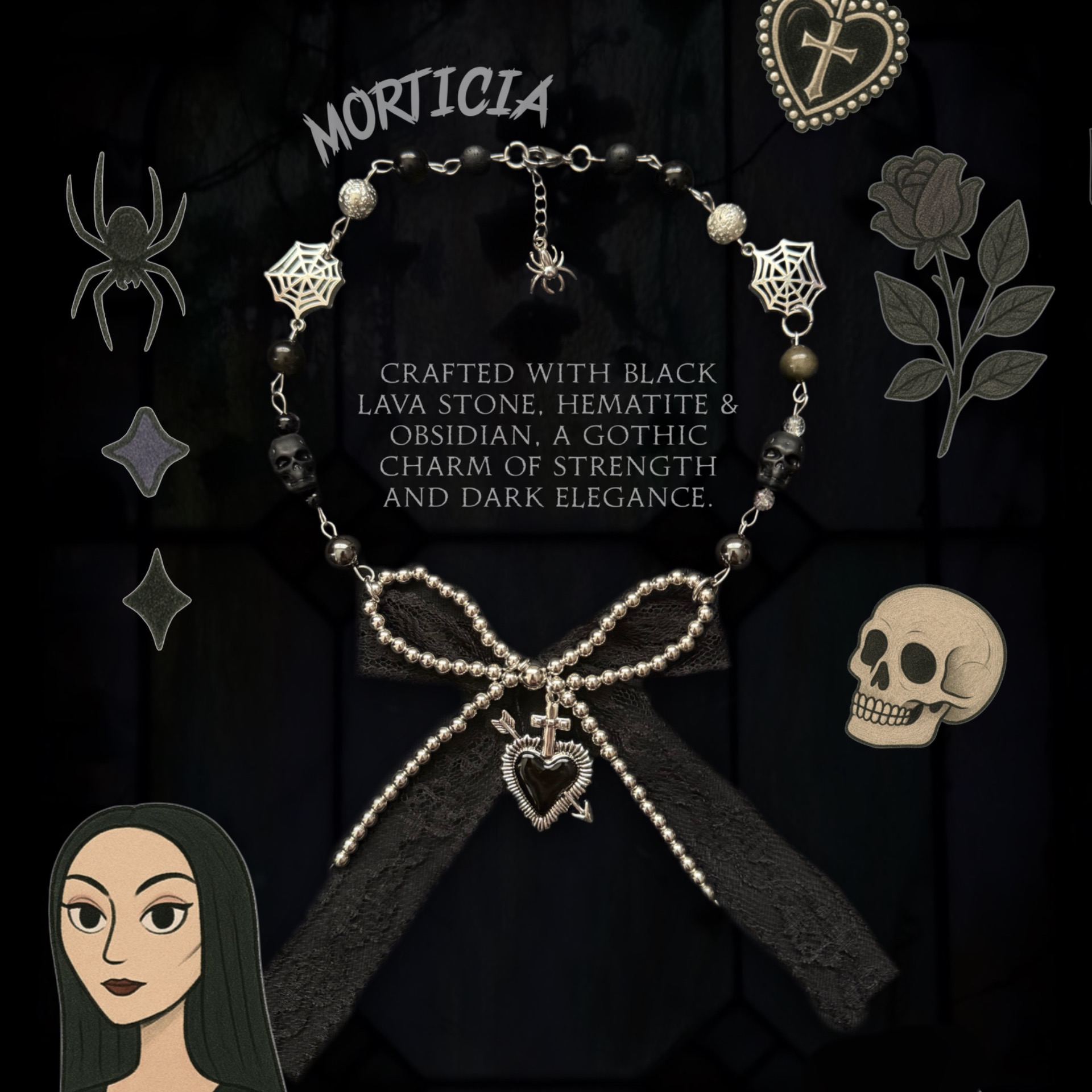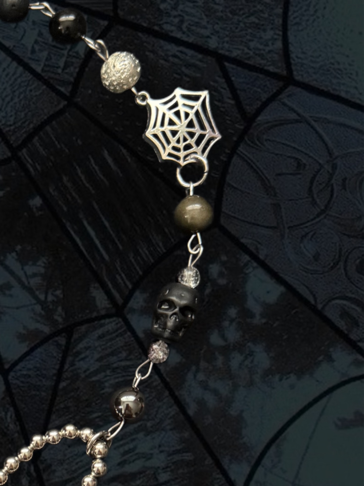 This necklace is part of the Halloween collection. It features black lava stone, hematite, and obsidian – a combination that brings strength, protection, and inner stability. Lava stone grounds and energizes, hematite boosts resilience and confidence, while obsidian acts as a protective shield against negativity. The necklace carries gothic elegance, dark beauty, and power that stands out on any occasion.  Components are made from Surgical Steel.