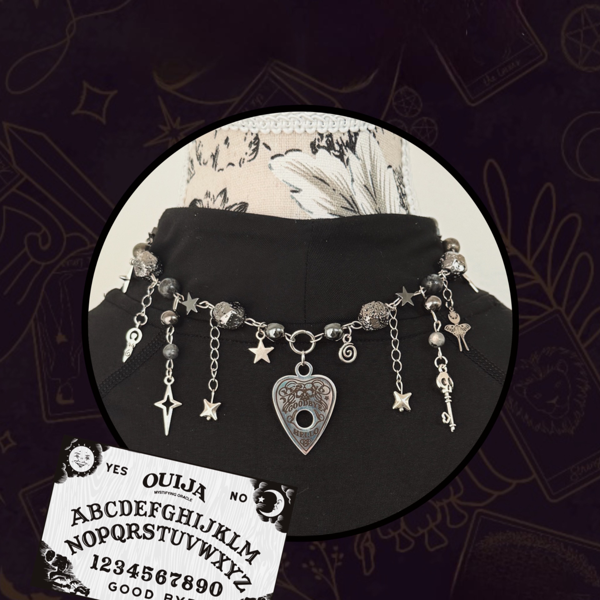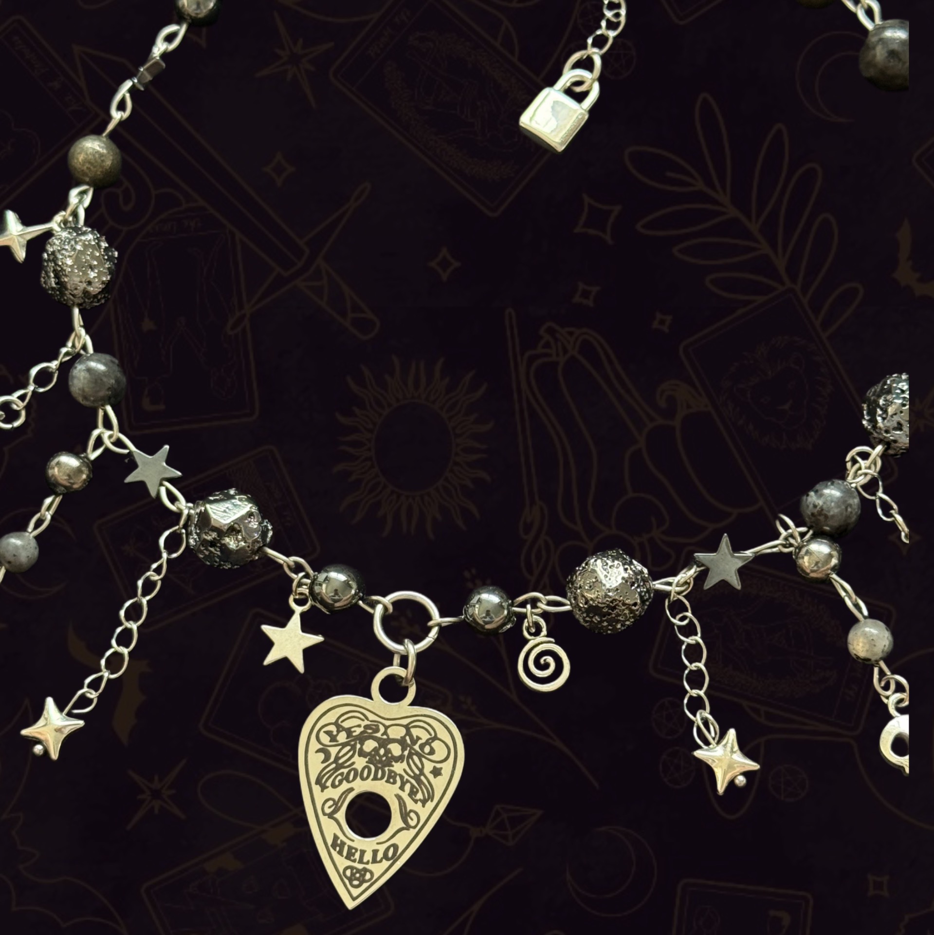 A handcrafted necklace inspired by the mystique of spirit communication and the symbolism of the planchette. Hematite provides stability and mental strength, lava stone grounds and shields, labradorite supports intuition and hidden insight, and pyrite attracts opportunity, prosperity and confidence. Made from surgical stainless steel with selected elements from high-quality fashion jewellery. Designed as a talisman for clarity, protection and inviting new possibilities. Length approx. 38-43 and can be adjusted upon request.