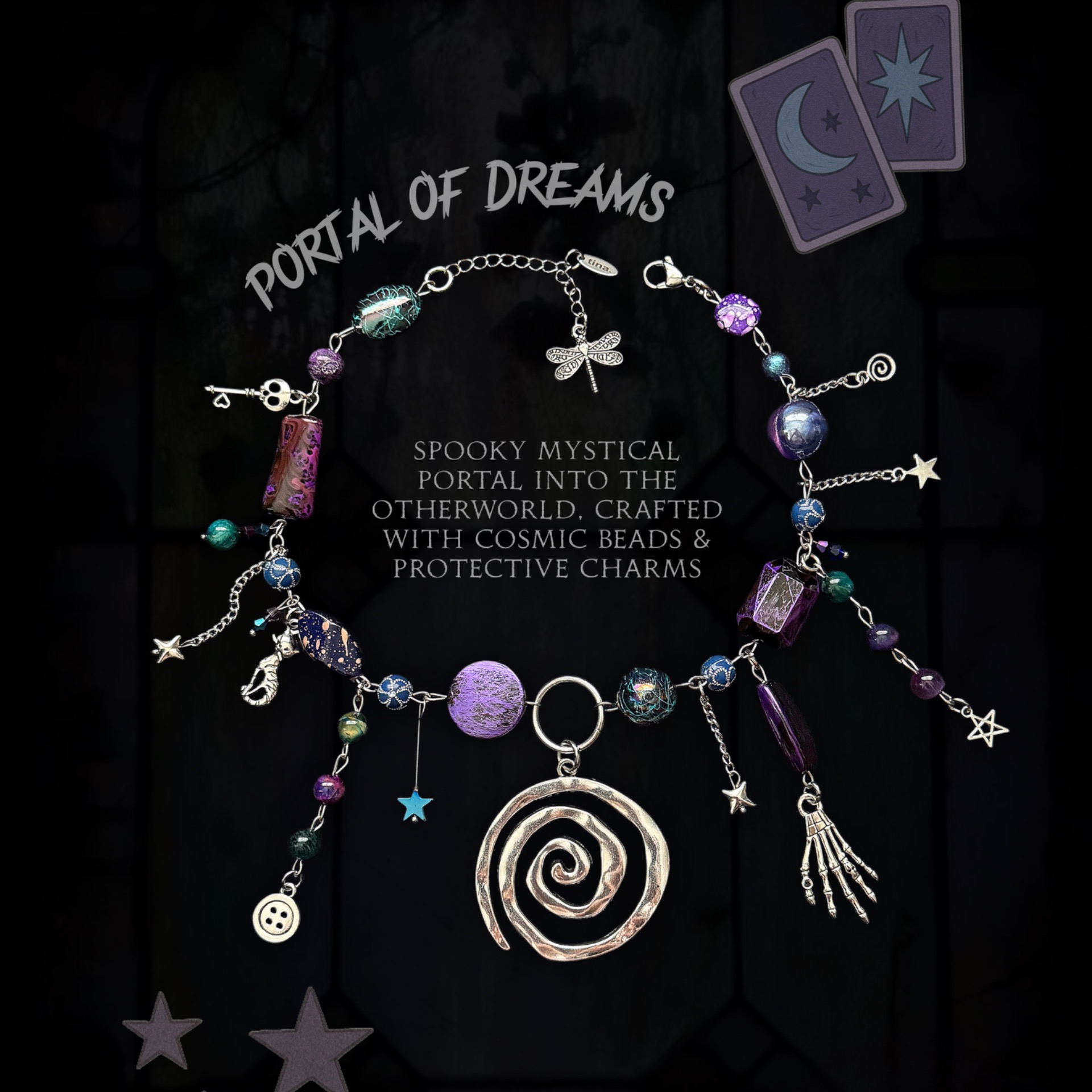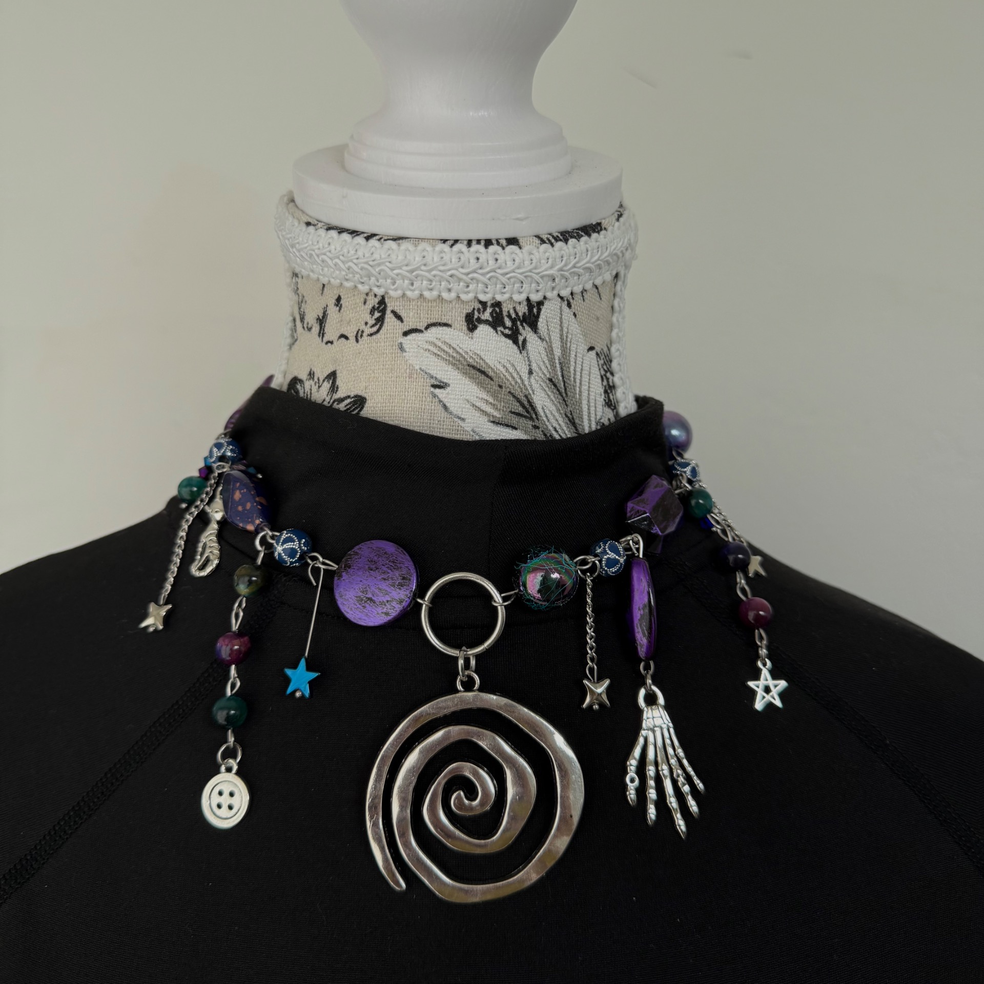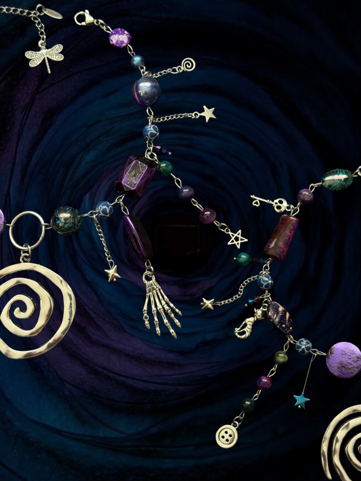 This necklace is part of the Halloween collection. It is crafted with cosmic beads and protective charms, representing the path to otherworldly realms and connection with the unknown. The spiral centerpiece symbolizes infinity, life cycles, and the opening of a portal to dreams and intuition. This necklace carries the energy of transformation, protection, and spiritual insight. The cat, hand, or spiral pendants are made of costume jewelry, while the components are made of surgical steel.