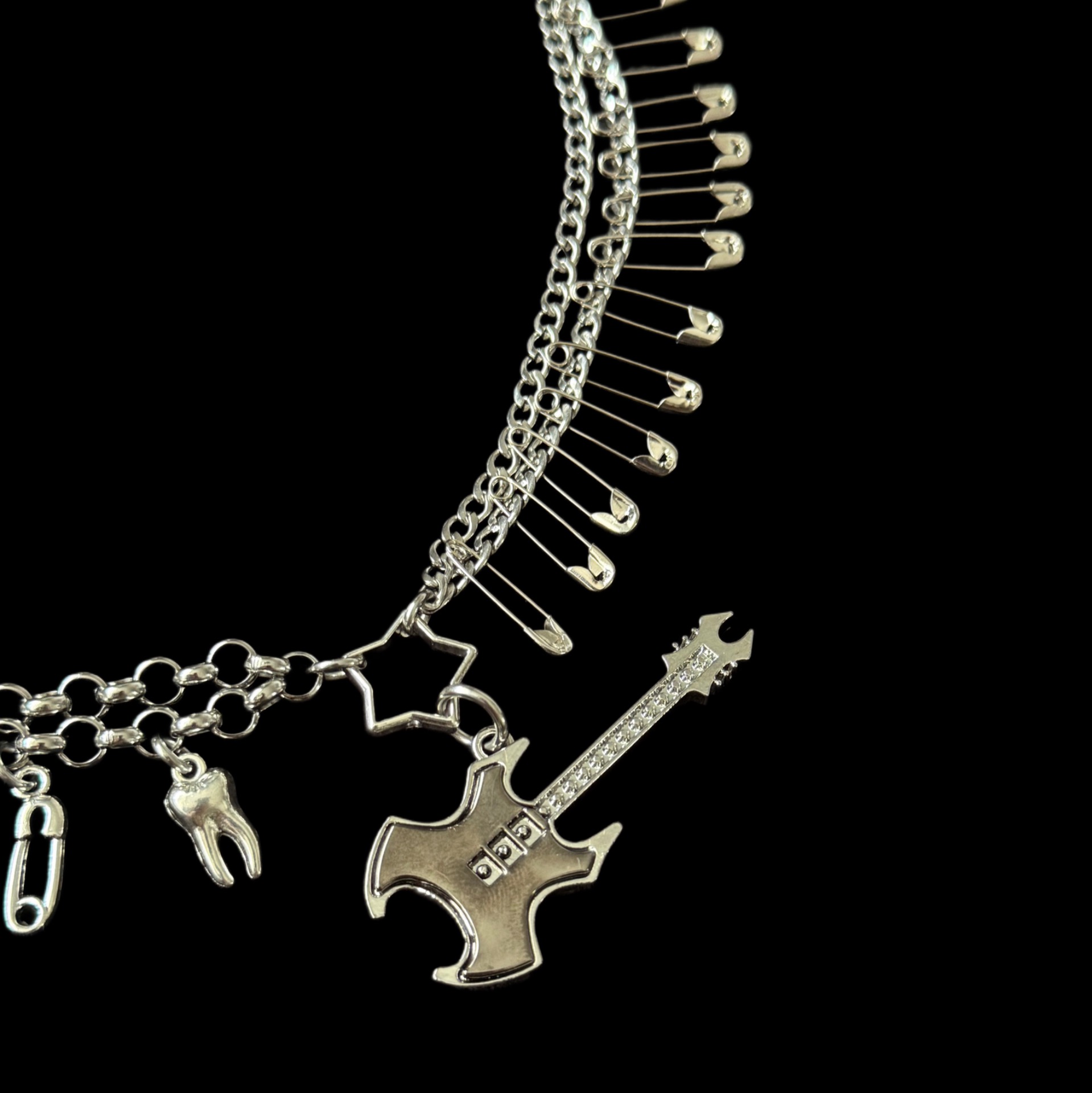 Tento náhrdelník je inšpirovaný ikonickou estetikou Sex Pistols – surovosťou, rebéliou a punkovým postojom, ktorý ignoruje pravidlá. Je vyrobený z chirurgickej ocele v kombinácii s bižutérnymi prvkami. Obsahuje retiazky, kovové prívesky a bezpečnostné špendlíky, ktoré sú pevne zalepené, aby sa pri nosení pri krku neotvárali. Dopĺňajú ho sivé perly a hematit, ktoré vyvažujú tvrdosť kovu jemným, no stále chladným leskom.