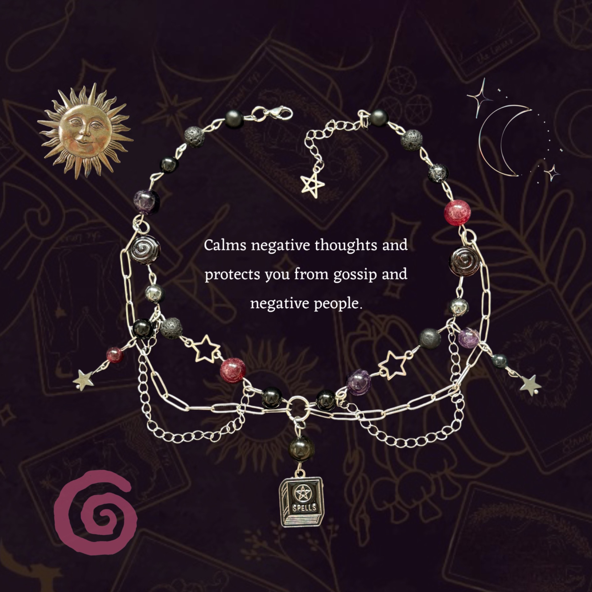 A handcrafted necklace inspired by the idea of a personal spellbook, carrying energies that calm the mind and shield the spirit. Amethyst brings inner peace and quiets negative thoughts, lava stone grounds and stabilizes, obsidian protects against unwanted influences, and red tourmaline supports emotional strength and balance. Created from surgical stainless steel with some decorative elements made from high-quality fashion jewellery. Designed as a protective talisman that acts as your energetic shield. Length approx 37-42 and can be adjusted upon request.