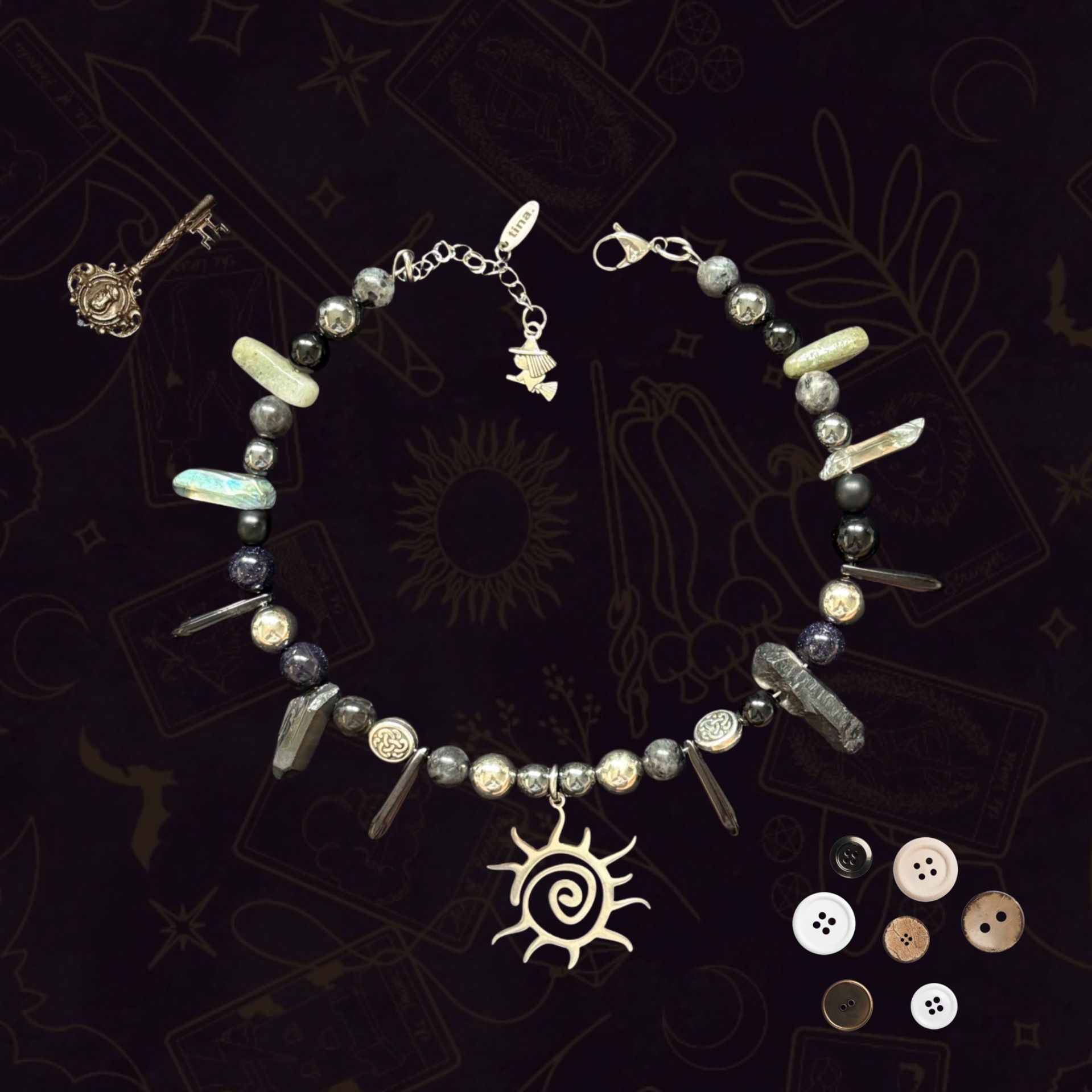 Ručne vytvorený náhrdelník inšpirovaný pradávnym symbolom špirály života, ktorý predstavuje osobný rast, obnovu a neustály pohyb energie. Modrý avanturín podporuje sústredenie, pokojnú odhodlanosť a vnútorný rozvoj, labradorit posilňuje intuíciu a otvára nové pohľady, hematit uzemňuje, obsidián chráni tvoje hranice a farbený krištál prináša jasnosť a smer. Vyrobený je z chirurgickej ocele, pričom niektoré ozdobné prvky sú z kvalitnej bižutérie. Vznikol ako talizman pre rast, vnútornú čistotu a plynulú transformáciu. Dĺžka je približne 38  a na želanie ju možno skrátiť alebo predĺžiť.