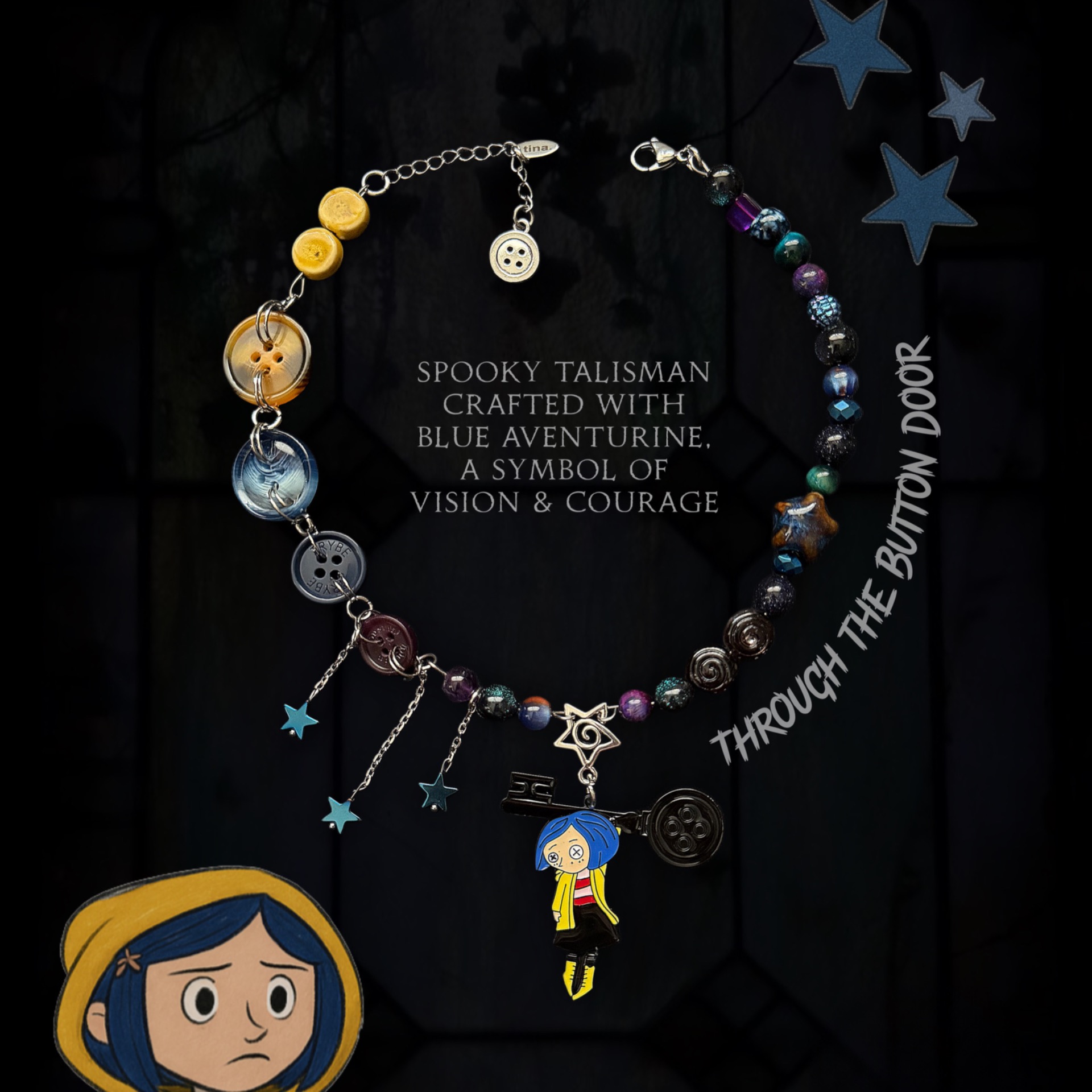 This necklace is part of the Halloween collection. It features blue aventurine – a stone of courage, clear vision, and inner strength. It enhances intuition, determination, and helps overcome fears. The symbolism of buttons highlights the connection between worlds, the fragile boundary between reality and dream, and the determination to walk your own path. This talisman is both a protection and a reminder that courage always opens new doors. Mix of surgical steel and costume jewelry.