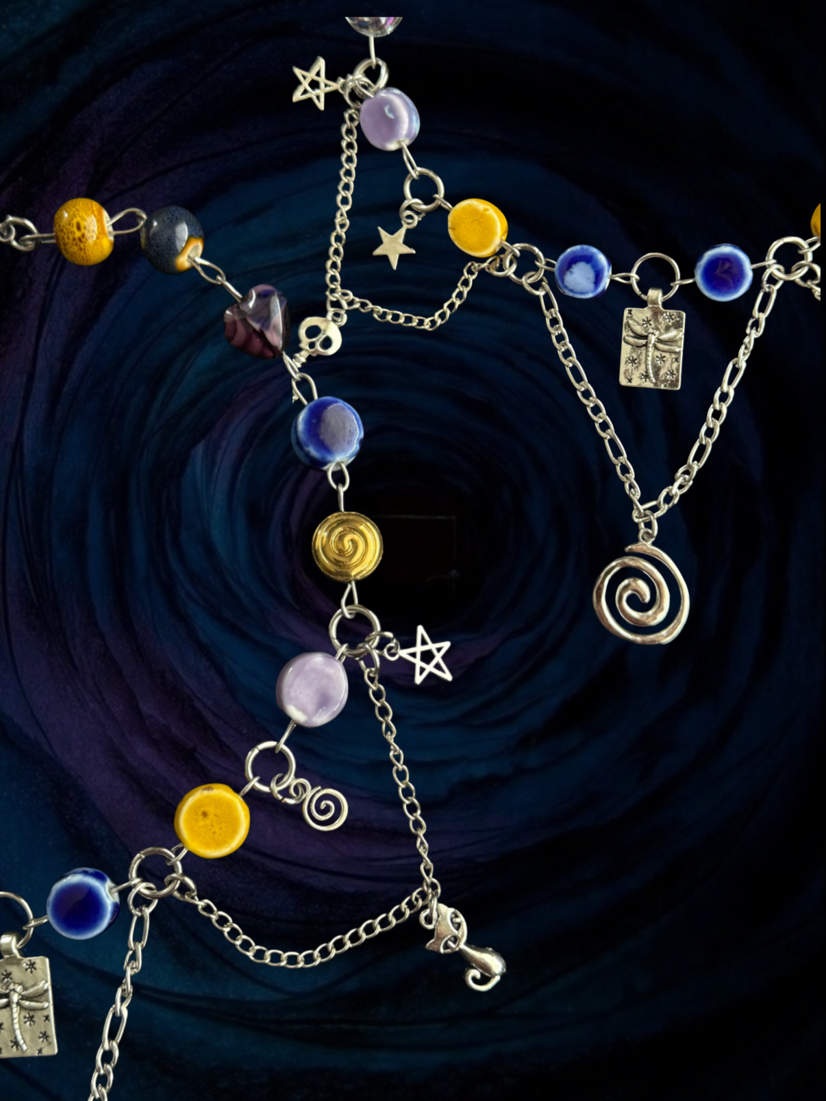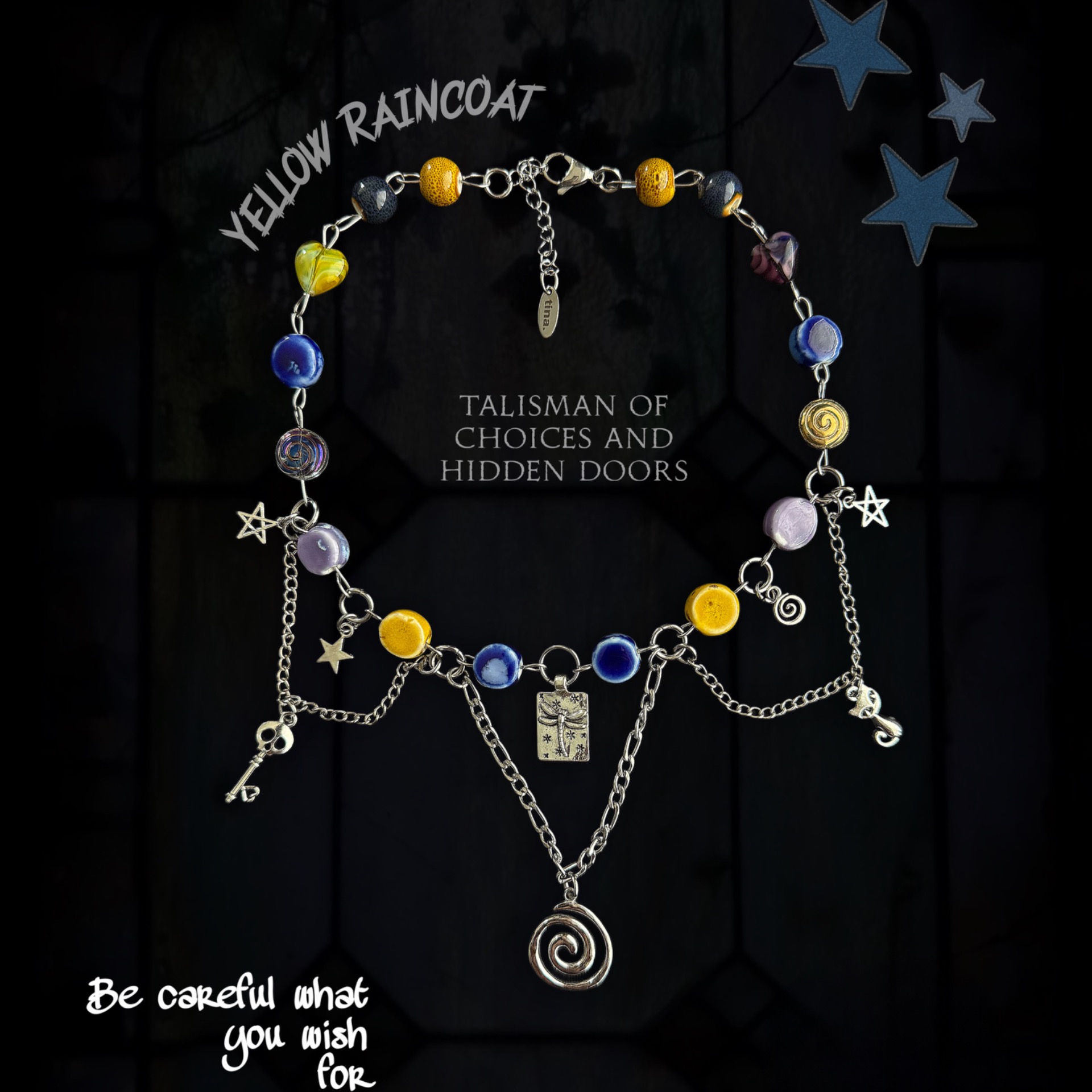 This necklace is part of the Halloween collection. It is crafted with colorful beads and adorned with symbols of keys, stars, and a spiral – representing choices, hidden doors, and paths yet to be discovered. Each element carries a message of mystery, reminding us that not everything is as it seems. This talisman serves as protection on the journey through the unknown and as a guide in making choices that shape our destiny. The pendants are costume jewelry but the components are made of surgical steel.